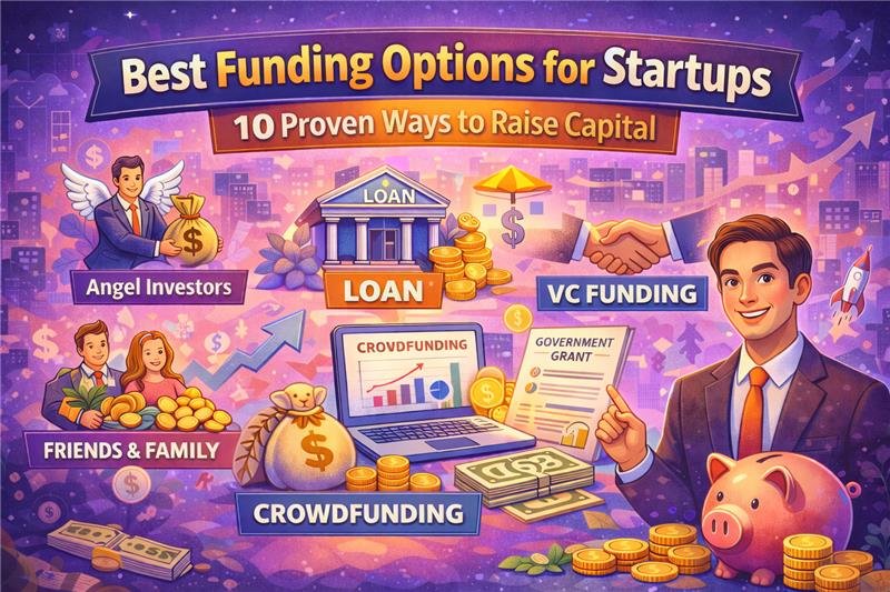 Common funding options include angel investors, venture capital, crowdfunding, seed funding, and bank loans.
